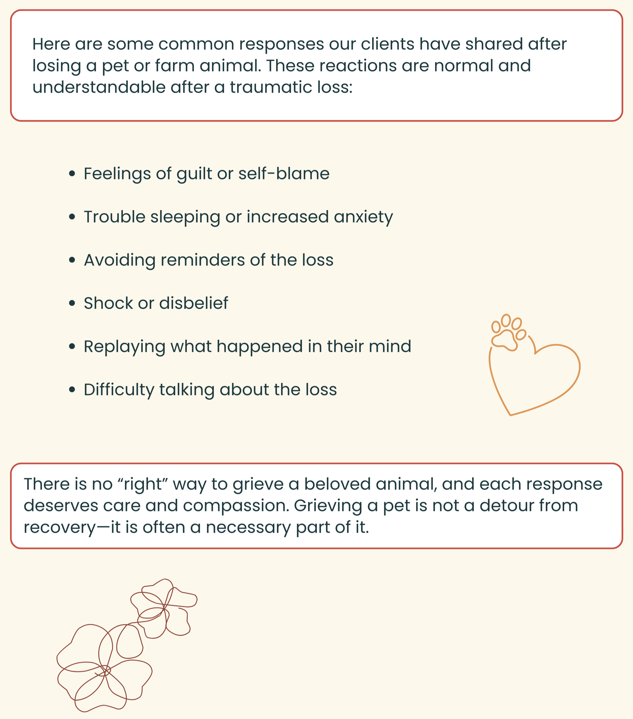 If you have lost a pet in your disaster, we strongly encourage you to reach out for support from Our Front Porch. Our team can offer emotional support and help connect you with therapists who understand grief, trauma, and pet loss.