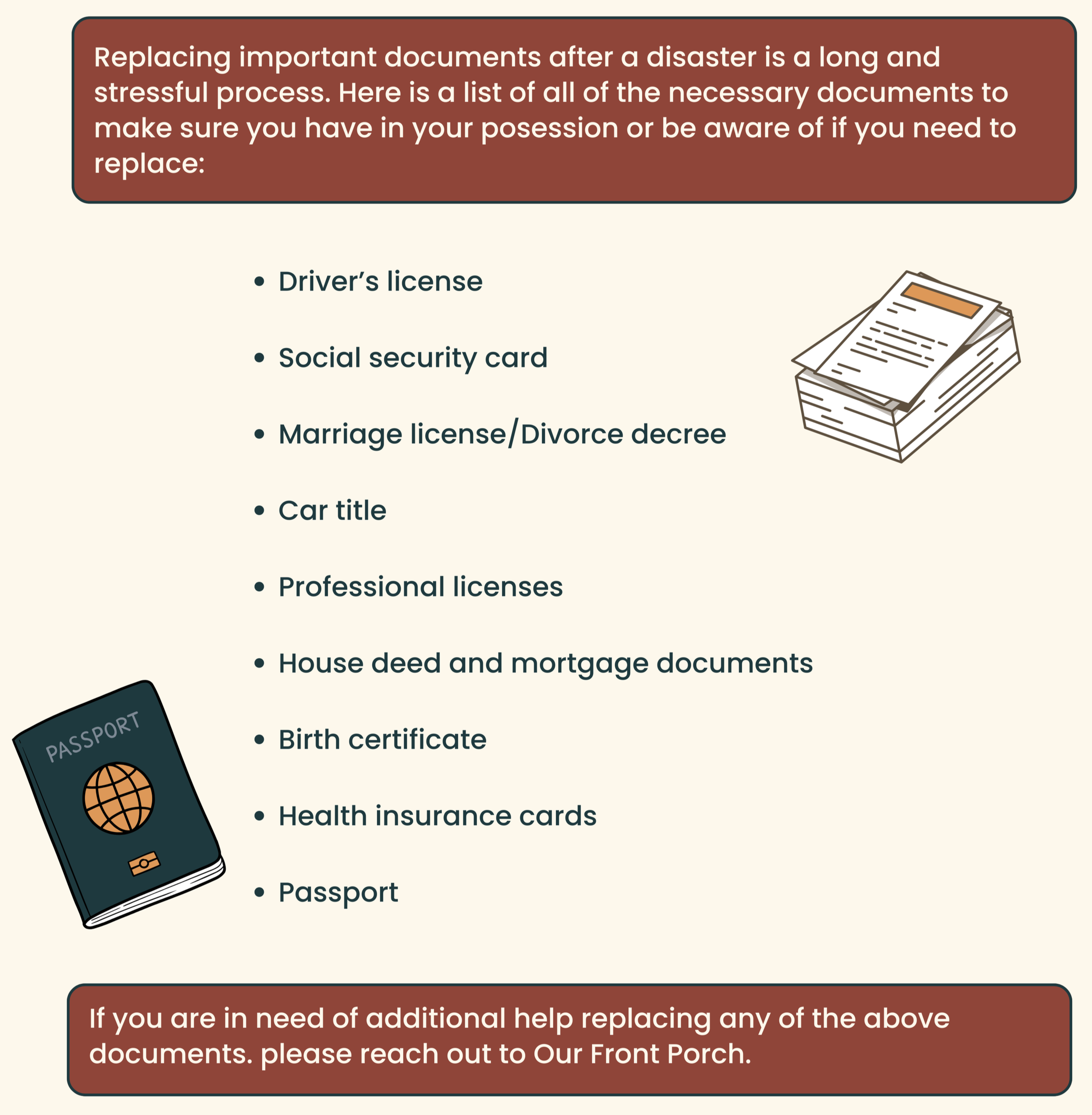 In the craziness of your world being turned upside down, you may not be able to recall everything that has been lost. Here is a list to help you remember. And if you need state specific resources or help figuring out how to start the process, just give us a call and we can direct you.